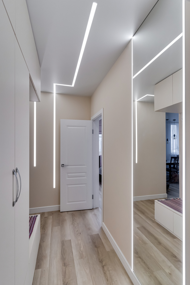 Идея №5. Все так же актуальна подсветка мебели и вертикальные световые линии от стены до потолка.